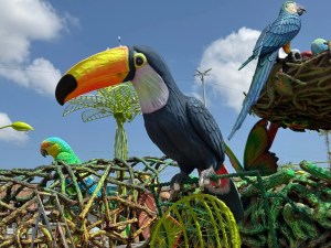 E a viagem lúdica pela Amazônia finaliza com o gigante ninho de pássaros, mostrando o berço da vida de aves tão belas da fauna, com papagaios, araras, tucanos, galos-da-serra, beija-flores e elementos da flora. Aqui, as cores são mais quentes e conduzem a um estado de contemplação.