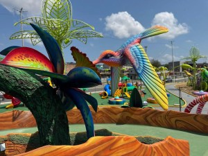 Todo o novo cenário tem piso em grama sintética, somando mais de 5 mil metros do material. Ao todo, nesta segunda fase que será entregue pela gestão municipal, são mais de 500 elementos entre esculturas, brinquedos, bancos, rampas e balanços.