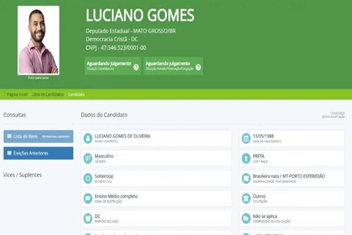 O pré-candidato a deputado estadual pelo Mato Grosso Luciano Gomes, do partido Democracia Cristã (DC), utilizou uma foto de Gil do Vigor – ex-participante do reality show Big Brother Brasil – em seu perfil no site de candidaturas e contas eleitorais do Tribunal Superior Eleitoral (TSE).