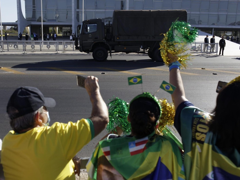 Durante o ato militar, havia na Praça dos Três Poderes, em frente ao Palácio do Planalto, alguns manifestantes contrário e favoráveis a Bolsonaro.