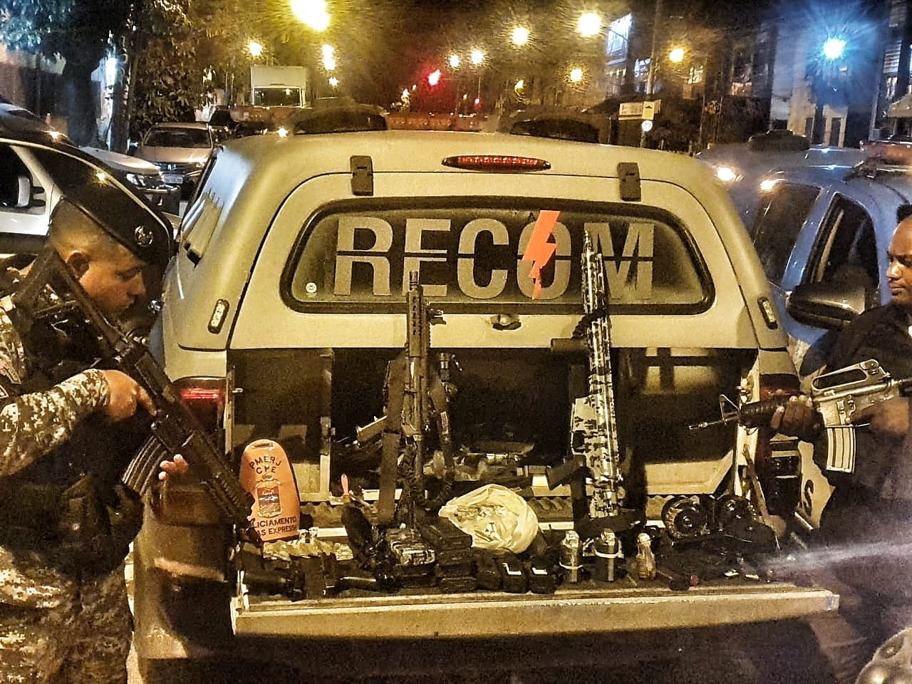 Dentro dos carros foram apreendidos dois fuzis, duas pistolas, três granadas, 10 carregadores de fuzis, 10 carregadores de pistolas, três rádios comunicadores, além de munição e drogas.
