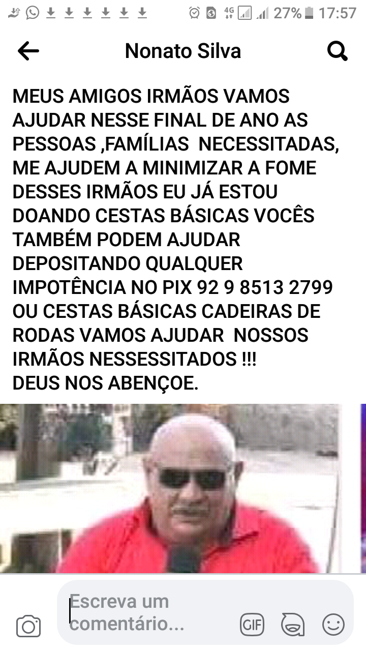 Nonato Silva está dosponibilizando nas redes sociaia o PIX 92 985132799 para quem puder e quiser ajudar a comprar mantimentos para a cesta de alimentos que será usada para “minimizar a fome desses irmãos” que não t condições financeiras para passar um Bom Natal.