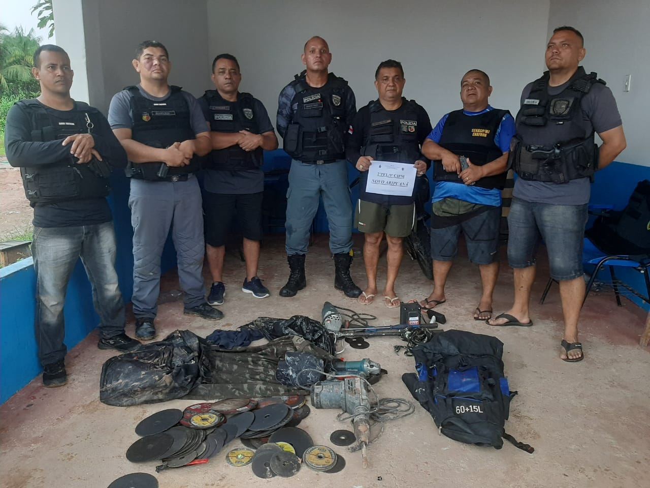 A Polícia continua em busca dos assaltantes e recolheu da Pick UP armas e as ferramentas.