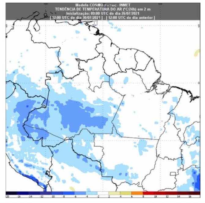 A previsão é realizada a partir do modelo matemático do Instituto Nacional de Meteorologia (Inmet), que aponta a possibilidade da queda de temperatura de 6°C a 8°C.