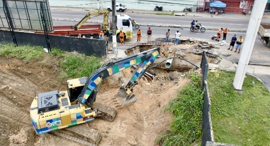 Em vistoria ao canteiro de obras na manhã deste domingo, 11/2, o engenheiro e subsecretário de Serviços Básicos da Seminf, Efrain Aragão, explica as causas da erosão na via. “Identificamos um problema na galeria de águas pluviais. A tubulação já apresentava riscos de rompimento, mas, com a forte chuva de ontem, sábado, houve uma sobrecarga em, ao menos, dez tubos”.