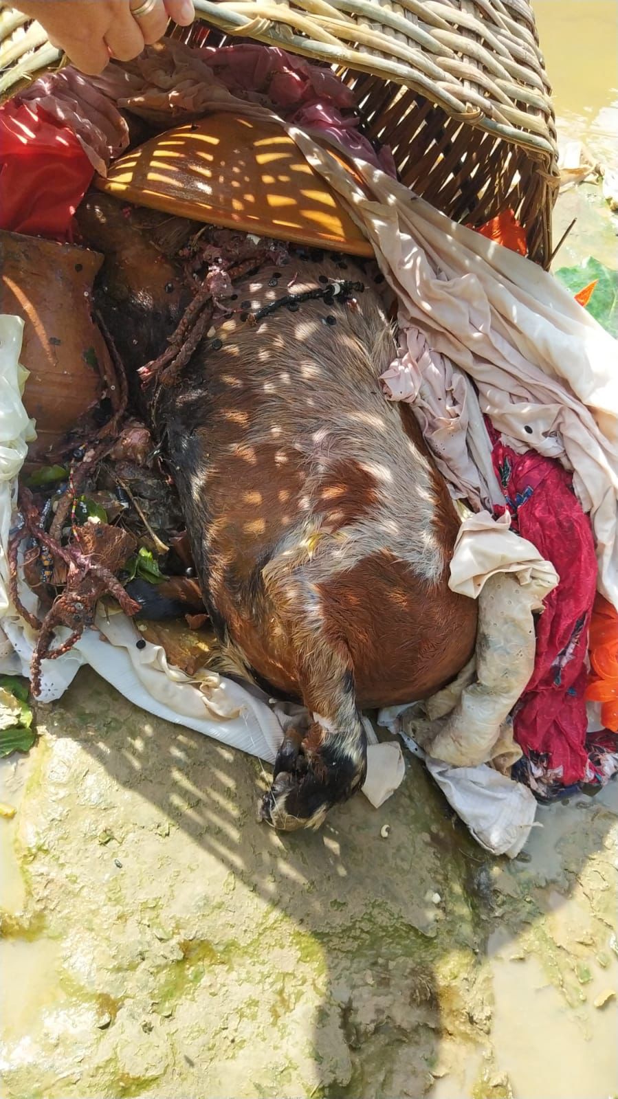 A princípio, os agentes acreditavam que seria um corpo esquartejado, mas ao atenderem a ocorrência, constataram que se tratava de um ritual religioso.