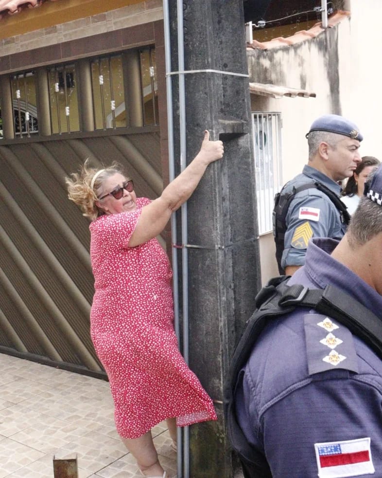 SENHORA SE AGARRA EM POSTE PARA NÃO INSTALAREM O MEDIDOR AÉREO NA SUA CASA E FOTO VIRALIZA NA INTERNET
