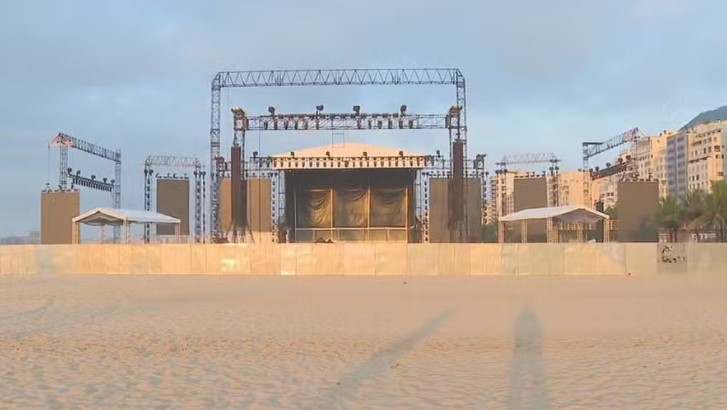 O palco está sendo montado na areia da Praia de Copacabana em frente ao Copacabana Palace, perto do Posto 2, voltado para o Leme.