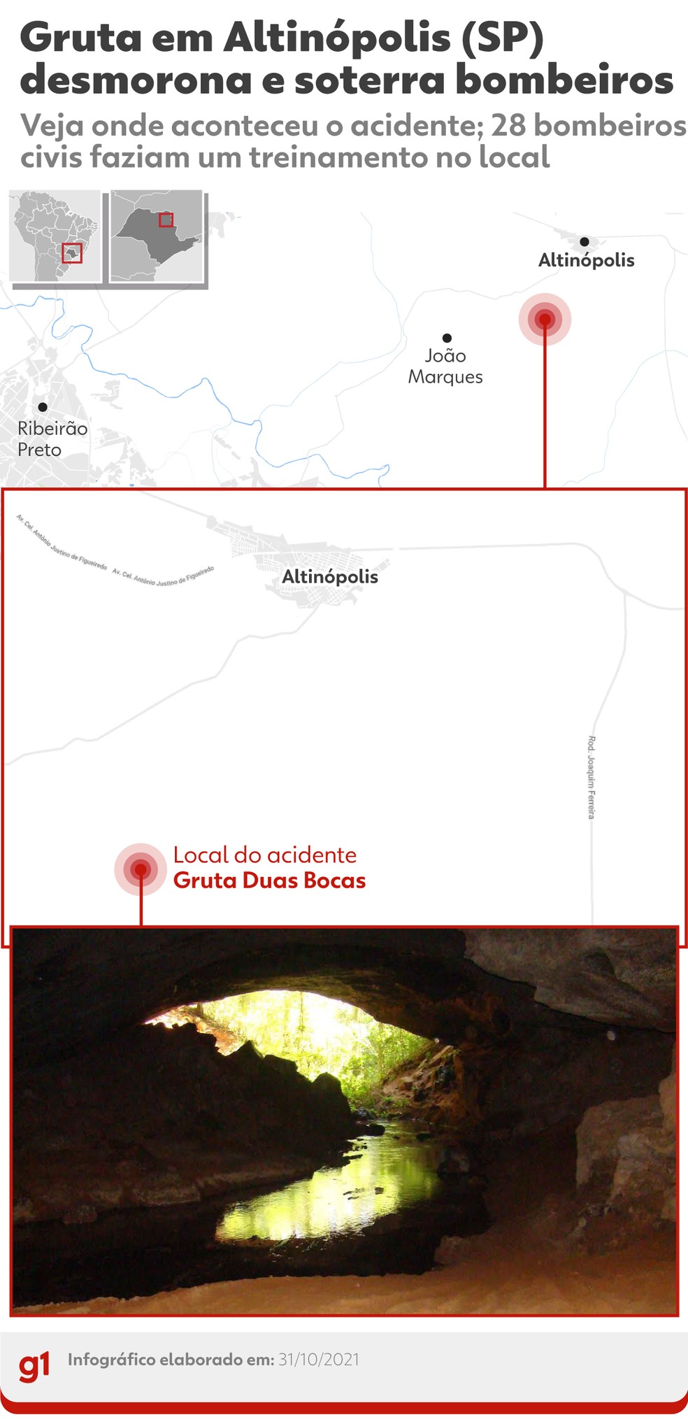 O desmoronamento aconteceu por volta da 1h deste domingo. De acordo com o Corpo de Bombeiros, 28 bombeiros civis e instrutores faziam um treinamento no interior da gruta, quando o teto da caverna desabou, deixando parte do grupo retido. A atividade era promovida pela escola Real Life, com escritório em Ribeirão Preto (SP).